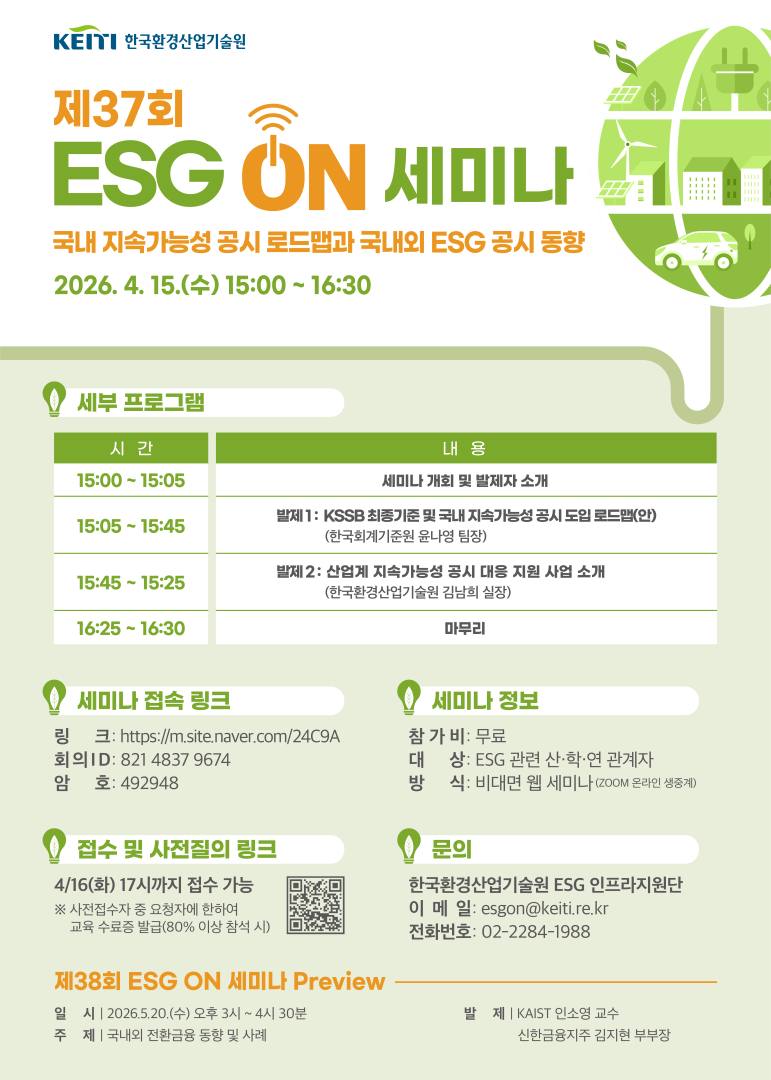 '국내 지속가능성 공시 로드맵과 국내외 ESG 공시 동향'을 주제로 제37회 ESG ON 세미나를 개최합니다.